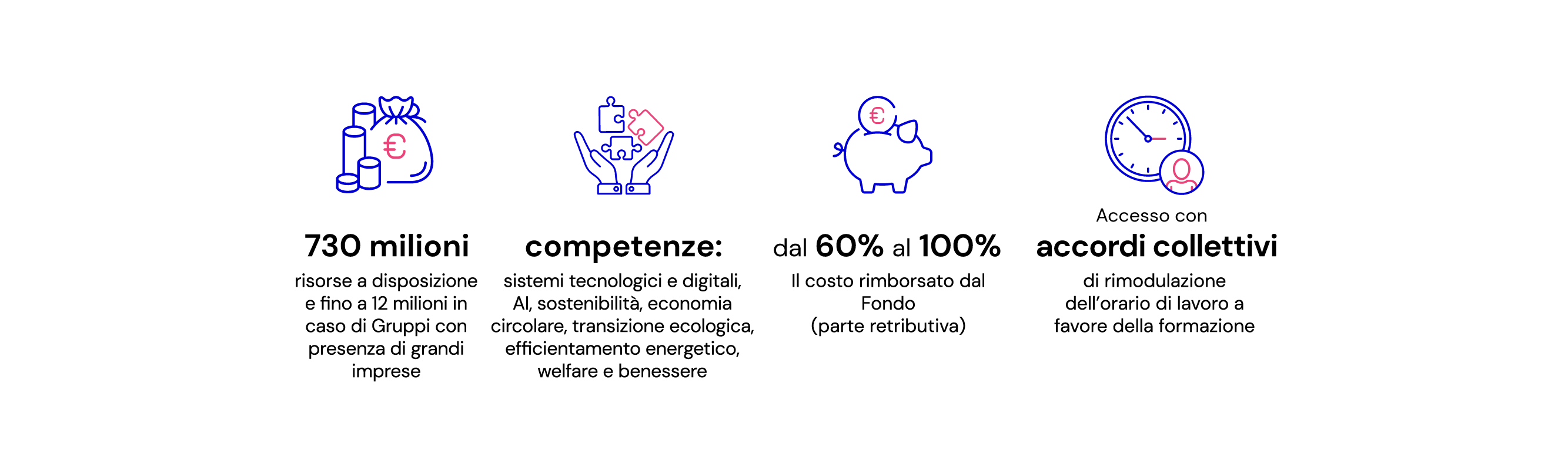 Il Fondo Nuove Competenze 2024, alla sua terza edizione, è un fondo pubblico nato originariamente per contrastare gli effetti economici dell’epidemia Covid-19 e attualmente pensato per dare sostegno alle aziende nella loro transizione digitale ed ecologica. Supporta le imprese nello sviluppo di nuove competenze nei loro processi di innovazione in ambito digitale, sostenibilità e green. Il fondo si farà carico di parte delle ore di stipendio del personale dedicato alla formazione.
