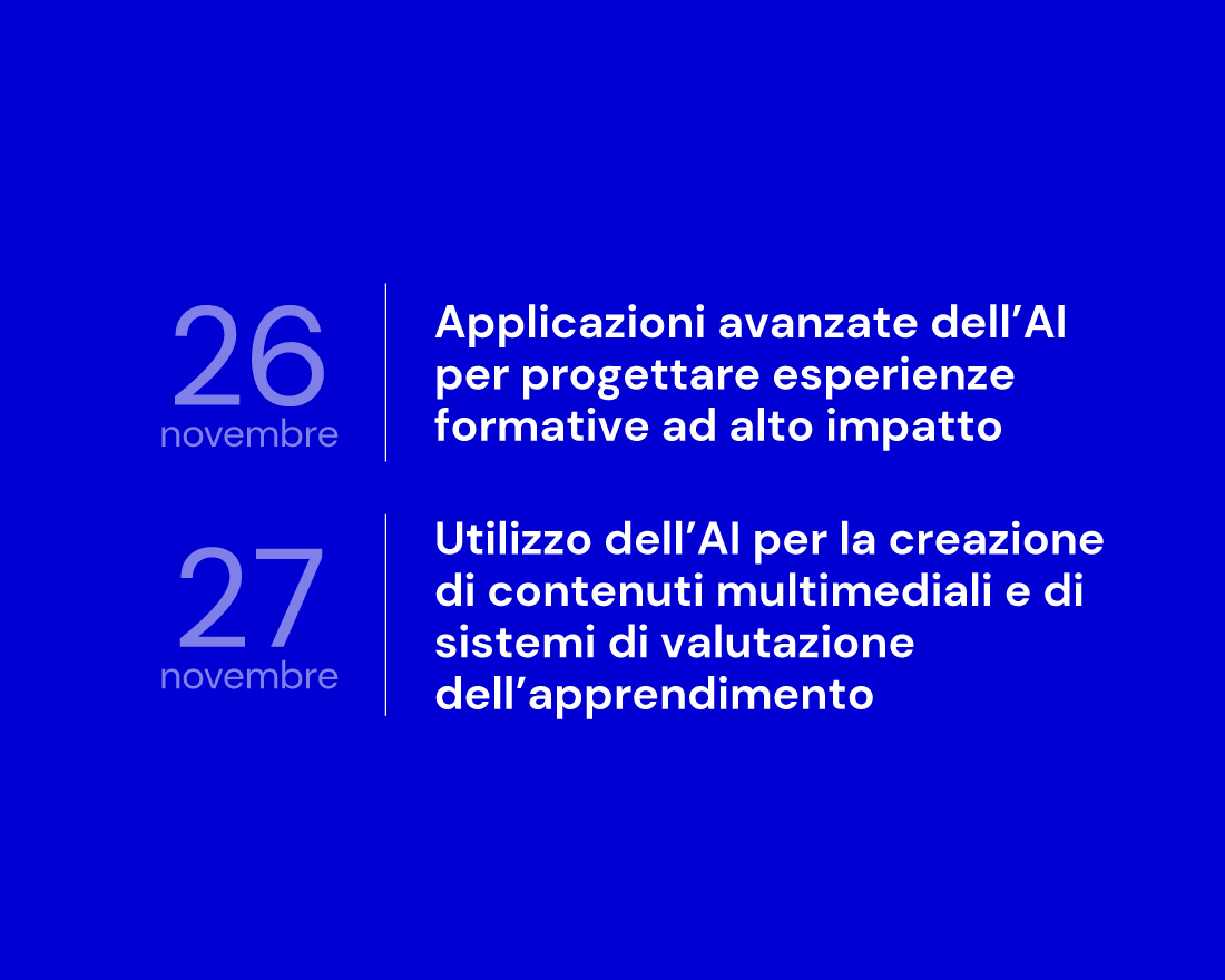 Puoi scegliere se esplorare il ruolo dell’AI nella formazione, dalle basi alle applicazioni avanzate, o se perfezionare le tue competenze didattiche con un percorso completo per trainer.